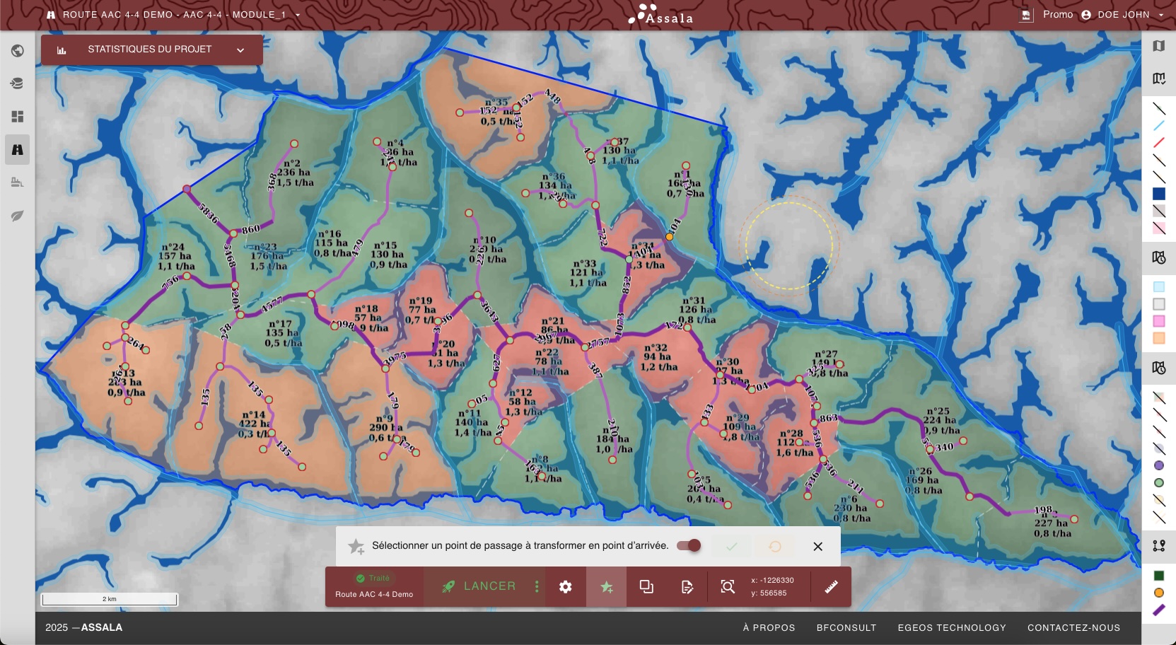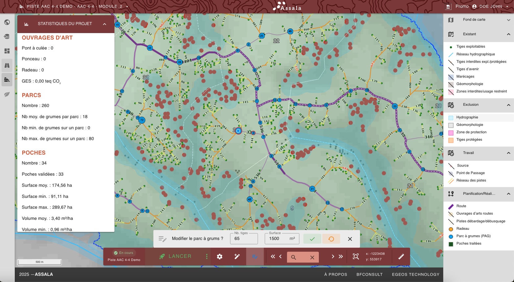 Générez des pistes connectant les arbres aux routes et positionnez des parcs à grumes au plus près des contraintes et des coûts. Priorisez l'efficacité et la productivité.
